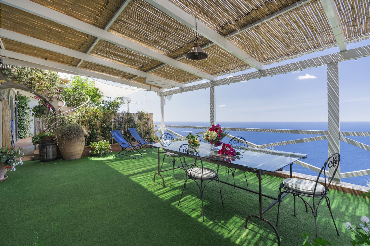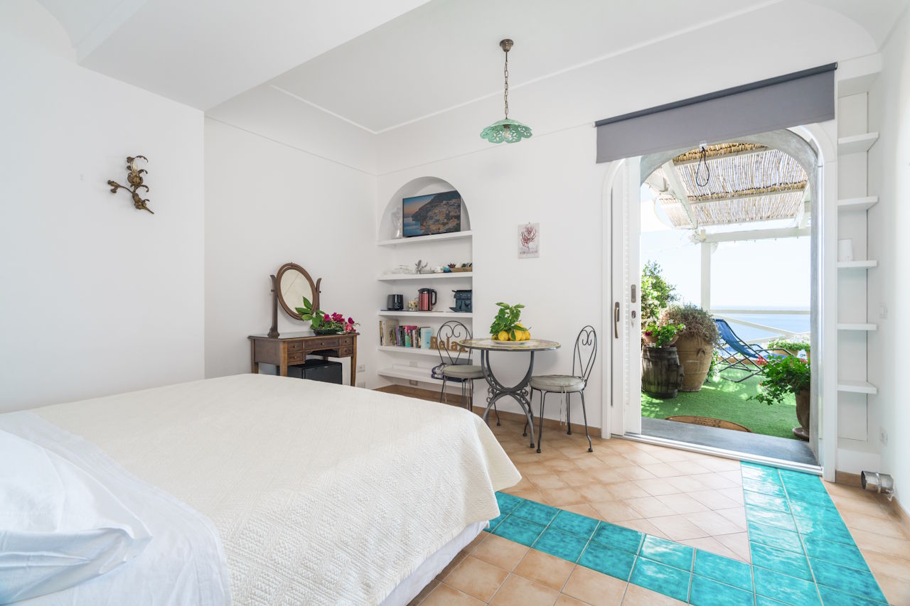 Camera Elia has a beautiful shared panoramic terrace, shared with the other rooms and apartments. It offers a beautiful view of the Faraglioni rocks of Capri and the Bay of Positano. It is partially shaded by a bamboo porch and furnished with a beautiful wrought-iron table and chairs.