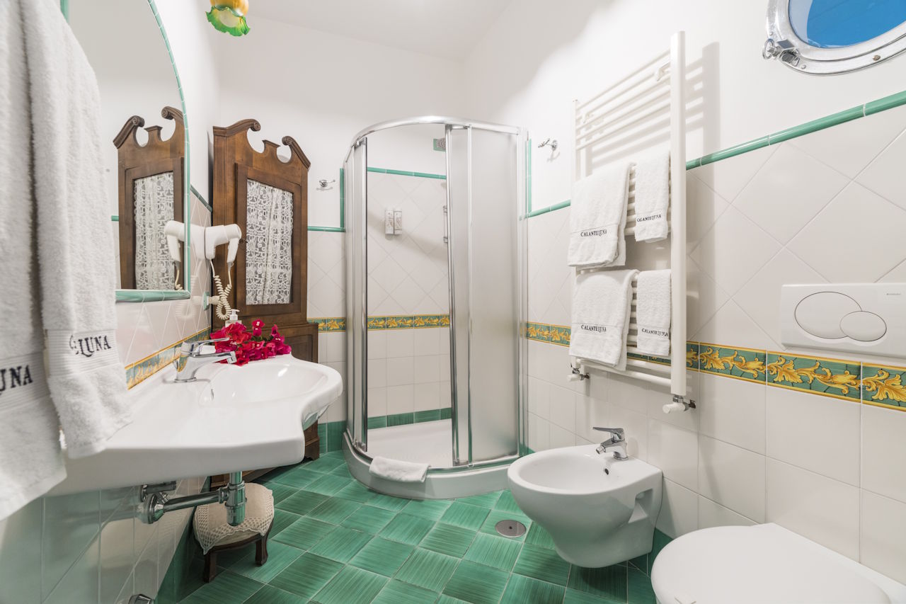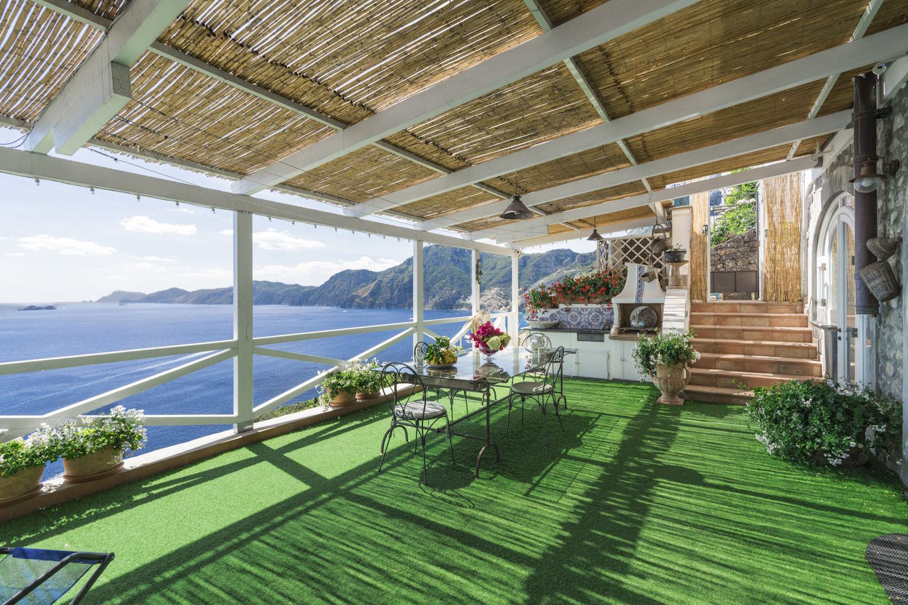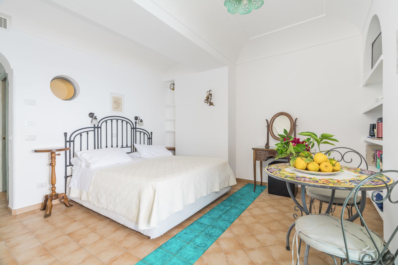 Camera Elia has a beautiful shared panoramic terrace, shared with the other rooms and apartments. It offers a beautiful view of the Faraglioni rocks of Capri and the Bay of Positano. It is partially shaded by a bamboo porch and furnished with a beautiful wrought-iron table and chairs.